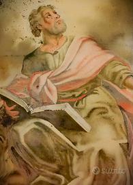 Descrizione: Maestro italiano del XIX secolo, olio su vetro. Nella tecnica del vetro inverso la tecnica è unica perché il lavoro viene eseguito sul retro del vetro. Mentre su una tela disegniamo la composizione a grandi linee per poi eseguire le aree piatte di colore per finire gradualmente con i dettagli, nella pittura su vetro rovesciato procediamo al contrario. Ciò significa che il pittore su vetro inizia con la finezza del lavoro per finire con i fondi. Quindi, fin nei minimi dettagli, il pittore deve immaginare fin dall’inizio la versione finale del dipinto per rendersi conto sapendo che dovrà anche gestire un “effetto specchio” durante l’esecuzione dell’immagine poiché ciò che è a destra è a sinistra. La pittura ad olio su vetro ha il vantaggio di offrire una buona protezione alla cromia, ma richiede una grande padronanza tecnica perché lo strato dipinto per primo sarà il primo strato visibile. Il vetro protegge la vernice e le conferisce il suo aspetto liscio e lucido. Attualmente un solo museo in Francia offre una collezione permanente dedicata alla tecnica della pittura su vetro rovesciato, o riparato sotto vetro: il museo di Revard, situato sul Monte Revard in Savoia. Nel caso in esame, è un ritratto dell’evangelista Marco. Il dipinto raffigura infatti il Santo, seduto su di un nimbo di nuvole, mentre si volta con lo sguardo rivolto al Cielo; il leone fa capolino alla sua destra. L'Evangelista, con barba e capelli canuti, è vestito di una tunica ocra chiaro dal meraviglioso panneggio fatto di chiaro-scuri, coperto sulle spalle da un mantello annodato cremisi; nella mano destra sostiene il Vangelo appoggiato sul suo ginocchio.