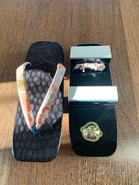 Sandali GETA giapponesi da collezione in seta e bambù laccato a mano. Nuove, mai utilizzate.