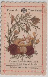Lotto di 3 santini antichi con incollati fiori; i santini Riportano le indicazioni "Fleurs de Terre Sainte. Posees sur le St. Sepolcre ", "Memento Gerusalem". Sul retro di uno compare la scritta "A Celsina. Ricordo del tuo fratello Trifonuccio. Emmaus 19 Dic. 1906."