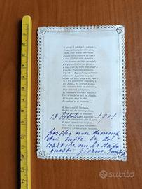 Santino ricordo della Prima Comunione, bordo traforato. Preghiera fronte/retro in lingua francese. Sul retro dedica in lingua italiana data 13 ottobre 1901.