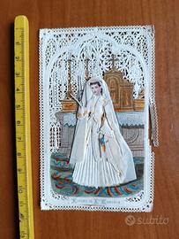 Santino antico, ricordo della Prima Comunione in carta traforata, abito della bambina incollato e in bassorilievo. Sul retro preghiera in lingua francese. Bordo in parte strappato.