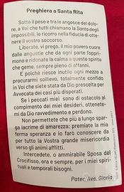 Santino Santa Rita da Cascia - Immaginetta Sacra Bellissimo santino (immaginetta sacra) dedicato a Santa Rita da Cascia, la "Santa degli Impossibili". • Fronte: Raffinata illustrazione a colori della Santa in estasi con angeli e simboli della Passione. L'immagine è quella venerata nella storica Chiesa di Santa Rita da Cascia (Via delle Vergini) a Roma. • Retro: Riporta la preghiera completa a Santa Rita per i momenti di difficoltà e dolore, con indicazioni per la recita finale (Pater, Ave, Gloria). • Editore: Editrice VELAR (Codice D337).