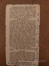 Santino d'epoca raffigurante San Nicola di Bari con l'iconografia classica dei fanciulli e delle sfere dorate. Presenta i caratteristici bordi seghettati e uno stile illustrativo tipico della metà del '900. Oggetto autentico per collezionisti di filiconia o devoti, in buone condizioni vintage con leggeri segni del tempo che ne confermano l'originalità. Perfetto da incorniciare o conservare in collezione. Santino, San Nicola, Bari, Immagine sacra, Vintage, Collezionismo, Filiconia, Arte sacra, Religione, Italia, Cartaceo antico. Hashtag: #Santino #SanNicola #Bari #Vintage #Collezionismo #ImmagineSacra #Filiconia #Religione #ArteSacra #HolyCard