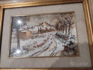 Antico quadro del pittore Saverio Taddei con cornice dorata - olio su tela - Strada campagna innevata. Misure 50*40.