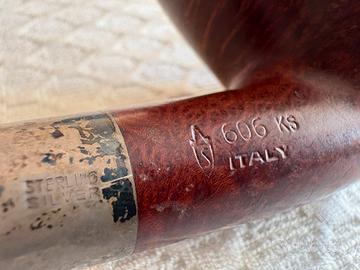 Per collezionisti e amanti del marchio Savinelli, propongo un pezzo di grande prestigio: la Savinelli Sterling Silver, modello 606 KS (King Size) Made in Italy. Questa pipa si distingue per l'elegante ghiera in argento massiccio punzonato 925, che certifica la qualità dei materiali.