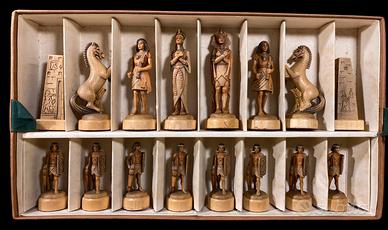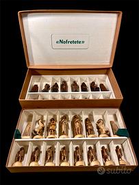 Questo set di scacchi è il modello n. 71811/K. Il Re è alto 11,7 cm. I Re e le Regine presentano l'adesivo di carta Anri sul lato inferiore delle loro basi. Questi pezzi degli scacchi statuari riflettono un caratteristico motivo egizio. Ciascuno degli scacchi Anri Nefertiti è magnificamente intagliato e dipinto a mano. I pezzi degli scacchi Anri Nefertiti sono realizzati in acero alpino Gli scacchi Anri sono realizzati al 100% in Italia per coloro che sanno apprezzare il vero valore di questi magnifici pezzi artistici. Gli scacchi e la scatola originale sono in ottime condizioni, non sono mai stati usati .