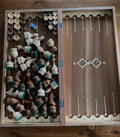 Il set comprende scacchi, dama e backgammon. La superficie della scacchiera è laccata e trattata per garantire protezione e durata nel tempo, così come i pezzi, anch’essi laccati con finitura protettiva. Le basi dei pezzi di scacchi e delle pedine da dama sono dotate di materiale antigraffio per preservare la superficie da segni e usura.