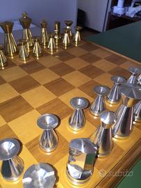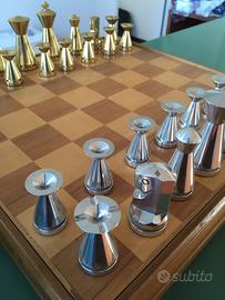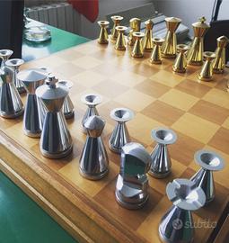 Scacchi serie unica realizzata in ottone e in alluminio con design unico. Pezzi lucidati e poi trattati con vernice trasparente e quindi non si ossideranno mai mantenendo la brillantezza originale della materia prima. Per collezionisti.