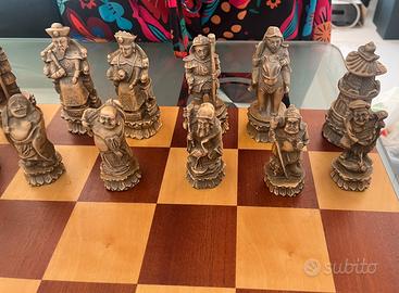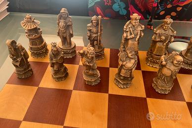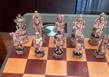 Vendo scacchi cinesi artigianali in legno , raffiguranti personaggi storici o mitologici, su base a forma di loto… mai usati, sempre tenuti sotto teca di vetro!! Insieme regalo scacchiera fatta su misura con teca in vetro per tenerli in ottime condizioni!! L’ultima foto dimostra ciò che sono realmente..