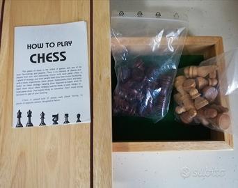 La scacchiera si apre e raddoppia; nella parte inferiore sono conservati gli scacchi, nelle bustine originali, e le istruzioni, in lingua inglese.
