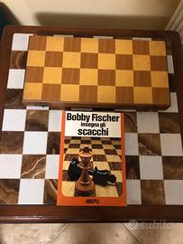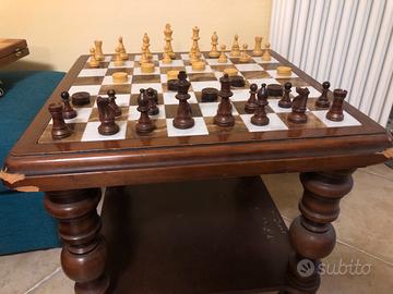 Tavolo in legno con piano scacchiera intarsiata di onice + scacchiera contenitore + scacchi e dama + libro del campione bobby ficher in regalo!!!! Due angoli del tavolo ahime, come si vede in foto, sono stati morsicati dal mio cucciolo di boxer quando ero assente, gli altri due erano contro al muro e si sono salvati. Giocavo col mio nonno 30 anni fa ma è tutto fermo da quell’epoca e mi serve spazio.