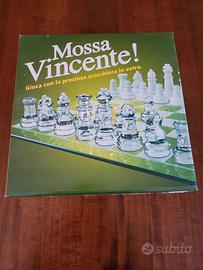 Sullo scatolo è scritto “Mossa Vincente! Gioca con la preziosa scacchiera in vetro.”