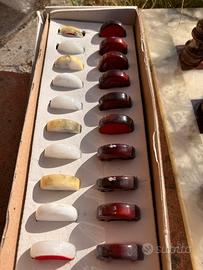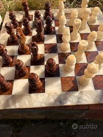 Scacchiera in alabastro marrone/bianco con pedine per dama e scacchi. Oresenti alcune scheggiature.
