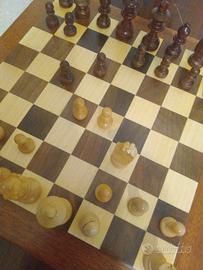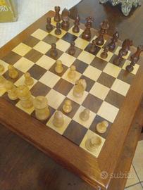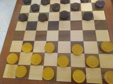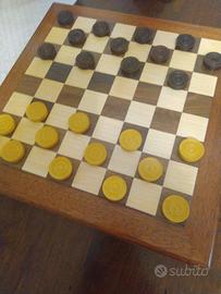 Scacchiera apribile in legno, artigianale, cm34x34x5 vintage, pezzi scacchi in legno Re cm 6h, pedine dama in legno cm. 3 diam.