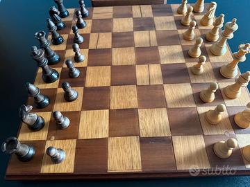 Scacchiera artigianale in legno massello intarsiata, completa di tutti gli scacchi.