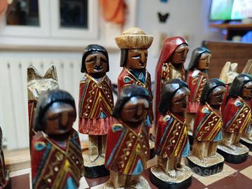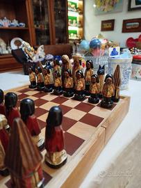 Scacchiera originale bellissima in legno intagliato e dipinto a mano pezzo unico
