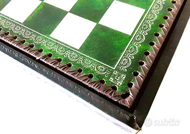 Importante e bella scacchiera in similpelle bianca e verde 35x35 cm., per 3,5cm. di altezza. Serie di scacchi Barbari Vs, Romani in metallo pieno rifinito a mano, altezza 7,4 cm., diametro base 2,4 cm. Comprese le pedine della dama. Alto artigianato made in Italy di Italfama, azienda di Calenzano (Fi). In questi colori non piu' in produzione.
