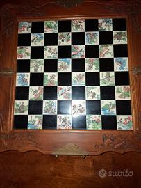 nelle caselle gli 8 immortali della mitologia taoista . ripegabile a forma fi valigetta con cassetti interni per i pezzi scolpiti a mano in pietra saponaria .