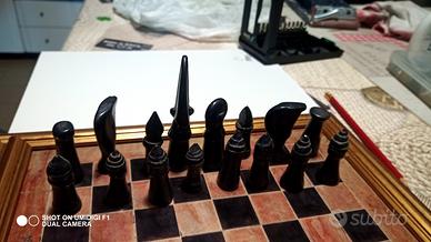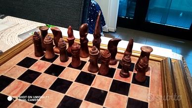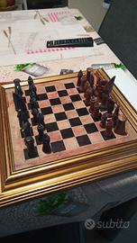salve vendo scacchiera con scacchi ,arte etnica in pietra ,la scacchiera e stata montata su cornice in legno misura 33 cm .utilizzata prevalentemente poco è più x esposizione.vendo x cambio arredamento non faccio spedizioni