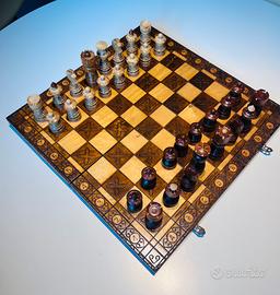 Scacchiera da tavolo in legno intarsiato a mano completa di 32 scacchi.