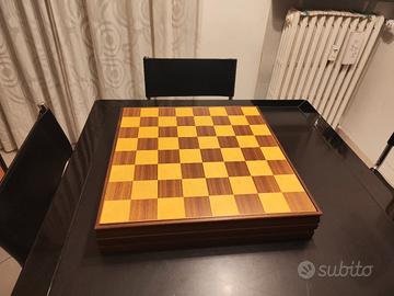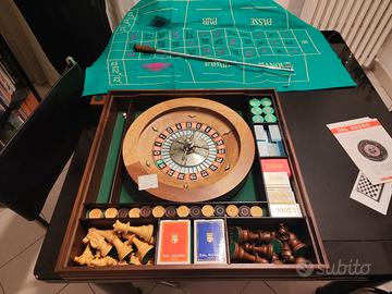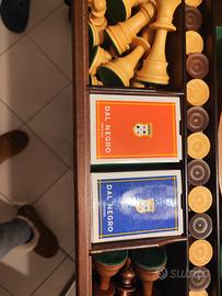 set multigiocoin legno, che include accessori per diversi giochi classici come la roulette, gli scacchi e probabilmente la dama/backgammon, prodotto dal marchio italianoDal Negro.