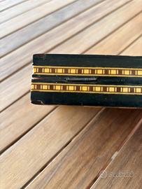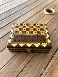 Bellissima scacchiera vintage da viaggio realizzata a mano con la tecnica dell'intarsio. Il design è caratterizzato da eleganti motivi geometrici e bordi decorati con estrema precisione.
