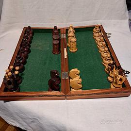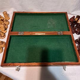 " vintage" . La misura della scacchiera aperta e di cm.40x40 con altezza di cm.3 .La misura degli scacchi varia da cm.5/6/7 . Il tutto viene contenuto ( come da foto )