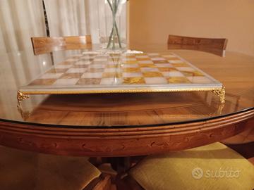 Scacchiera in onice alabastro e marmo con struttura in ottone (38×38) e scacchi in peltro e ottone di pregiata fattura, tutto in perfetto stato. NON SI EFFETTUANO SPEDIZIONI.