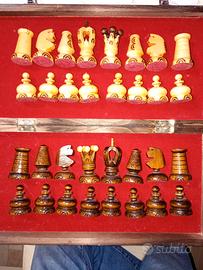 Vendo bellissima scacchiera risalente algi anni 90, perfettamente conservata. Base intarsiata e richiudibile con interno in velluto rosso (Dimemsioni38x38) Pezzi intarsiati con base in velluto rosso. Richiesta euro 35. Tel. 347/6636020