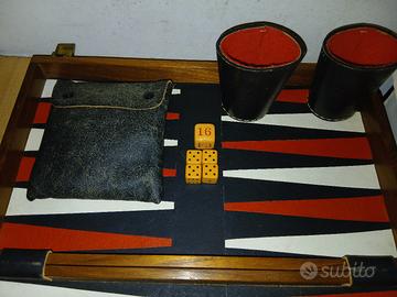 Scacchiera in legno per il gioco della dama, del black gammon e degli scacchi non forniti. L' interno e' rivestito in pelle perfetto mai usato. Corredata dei dadi di gioco e dei bicchieri per il lancio degli stessi. Scacchiera di origine inglese anni 60. Richiudibile. Campo di gioco netto della scacchiera 35x35