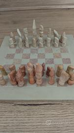 Scacchiera originale realizzata in pietra saponaria,base in perfette condizioni. Completa di tutte le pedine, sebbene qualcuna, come visibile da foto, sia stata incollata a seguito di rottura.