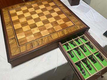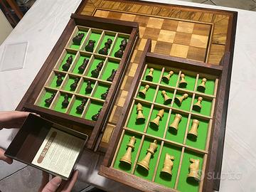 Scacchiera con piano in vero legno intarsiato Cornice lavorata Misure 67x67 Cassetti integrati con panno verde Pezzi (marca Dal Negro) Vintage anni 70