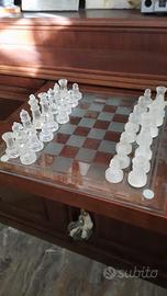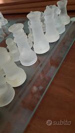 Scacchiera da gioco in vetro trasparente / satinato. Set completo di 32 pezzi in vetro ben conservati come da foto.