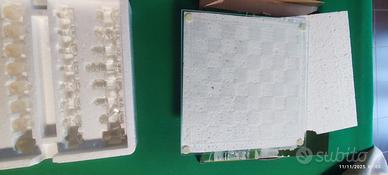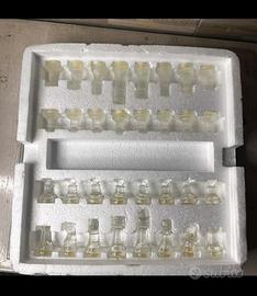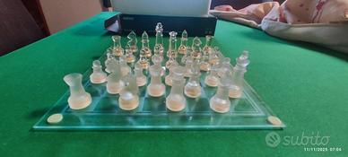 Elegante scacchiera in vetro, completa di tutti i pezzi per giocare. Perfetta per gli amanti del gioco degli scacchi.