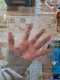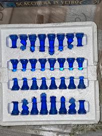 Scacchiera in vetro satinato e trasparente completa di tutti i 32 pezzi.