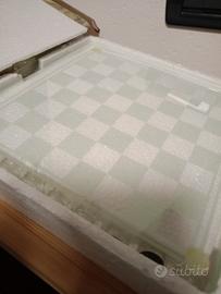 Piccola scacchiera in vetro cm 20x20 con 32 pezzi in vetro (trasparente e satinato).