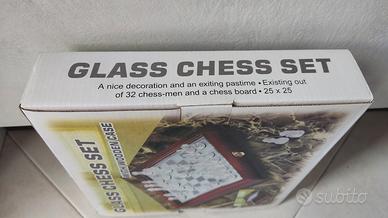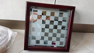 Nuovissima scacchiera con pezzi in vetro smerigliato e satinato, custodia in legno rosso scuro integrata, base a specchio. Perfetta come idea regalo. Mai usata in condizioni impeccabili.