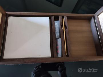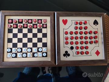 Bella scacchiera magnetica da viaggio in legno. Modello vintage, mai usata, corredata dalla sua scatola originale. Si apre come un cofanetto e all'interno contiene una penna, pedine di ricambio, contenitore di carta per appuntare i risultati delle partite e alloggiamento per carte da gioco