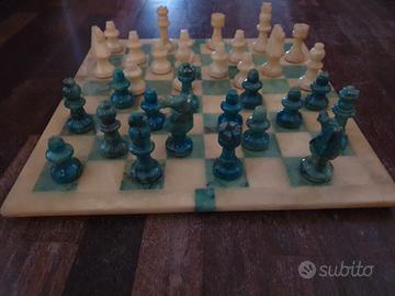 gioco degli scacchi e pedine da gioco dama tutti i pezzi hanno sotto il feltrino , in alabastro. non so giocare a scacchi quindi ho disposto i pezzi solo per controllo.