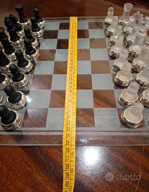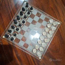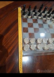 scacchiera 35×35 in vetro e con ghiera d'argento 925 nelle pedine Paterna & Livi. Nuova ,mai usata con proprietà scatola .