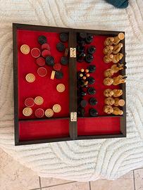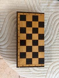 Scacchieta in legno con velluto risso, scacchi e pedine in legno.