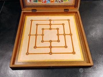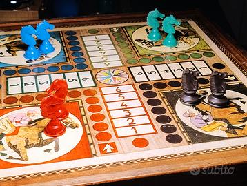 Scacchiera con Giochi da tavolo originale francese Garnier in legno vintage. Include: Gioco dell'oca, Petits Chevaux o Ludo (Pachisi), Tris e Scacchi o Dama. Un pezzo da collezione degli anni '60. Scacchiera in vero legno in ottimo stato.