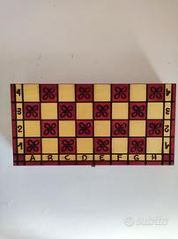 scacchiera pieghevole con lettere e numeri, comprensiva di scacchi. Marca Argenti Shara. Nuova, mai usata. Confezione originale.