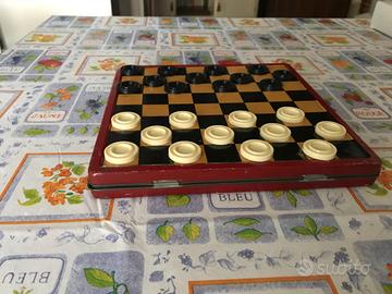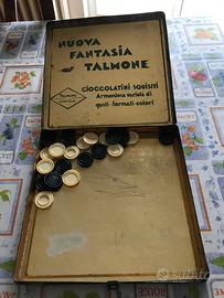 In complessive buone condizioni e piuttosto rara questa scacchiera in ferro della Talmone completa con le sue pedine di dama e con nel retro la tavola per il gioco Mulino (o schiera). Risalente agli anni 60 era probabilmente un gadget omaggio a seguito di un certo numero di acquisti di cioccolatini. Da non perdere ! (il lato misura 22 cm)