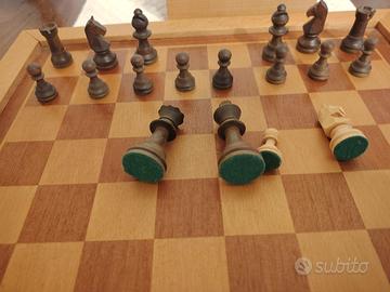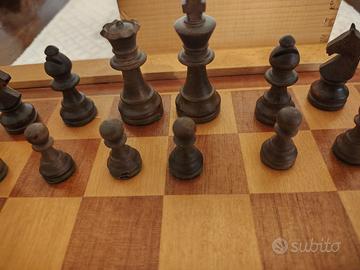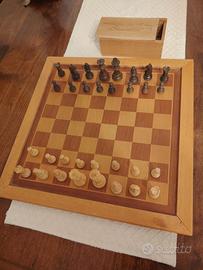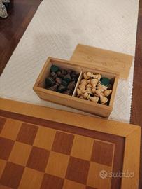 scacchiera vintage in legno intarsiata, cm 36x36, pezzi scacchi in legno feltrati Re cm 6H, ,scatola in legno porta pezzi.(S 28.4.26)