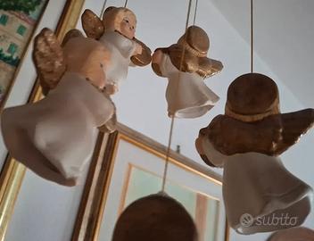 Scacciapensieri vintage composto da cinque angioletti di porcellana decorata a mano, dieci perline e un cerchietto in alto pure lui di porcellana. Gli angioletti sono alti 9 cm, il diametro del cerchietto è 11 cm e la lunghezza complessiva del tutto 76 cm. Oggetto ben conservato, come nuovo, da collezione o esposizione
