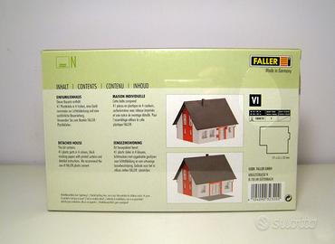 Vendo scatola di montaggio marca Faller in scala N 1:160 composto da 41 pezzi per realizzare una villetta unifamiliare di recente costruzione per ambientazione ferroviaria in un plastico o diorama.