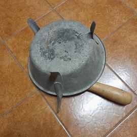 vecchio scaldino a bracere. Si usava per scaldare il letto, inserendolo sotto le coperte tramite una struttura apposita, in legno e con rivestimento in lamiera nella parte sotto e sopra al braciere.
