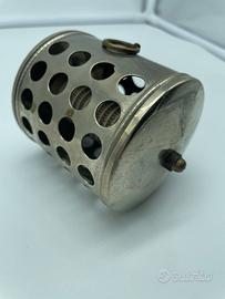 Scaldino antico elettrico in metallo primi ‘900, corpo cilindrico forato con resistenza interna spinotti laterali per collegamento alla rete elettrica e anello superiore per il trasporto e la sospensione. Sul coperchio è presente la punzonatura “V 160” indicativa della tensione 160 Volt tipica degli impianti elettrici d’epoca. Veniva usato come scaldamani o scaldino portatile dimensioni cm 8x6,5.