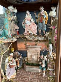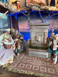 Scarabattola di noce in radica di noce con 4 colonne con base e capitelli in marmo pregiato. Personaggi pregevoli di H circa 45cm e con vestiti antichi, fontana in pietra lavorata. Effetti giorno/notte e ciclo sonoro con faretti.